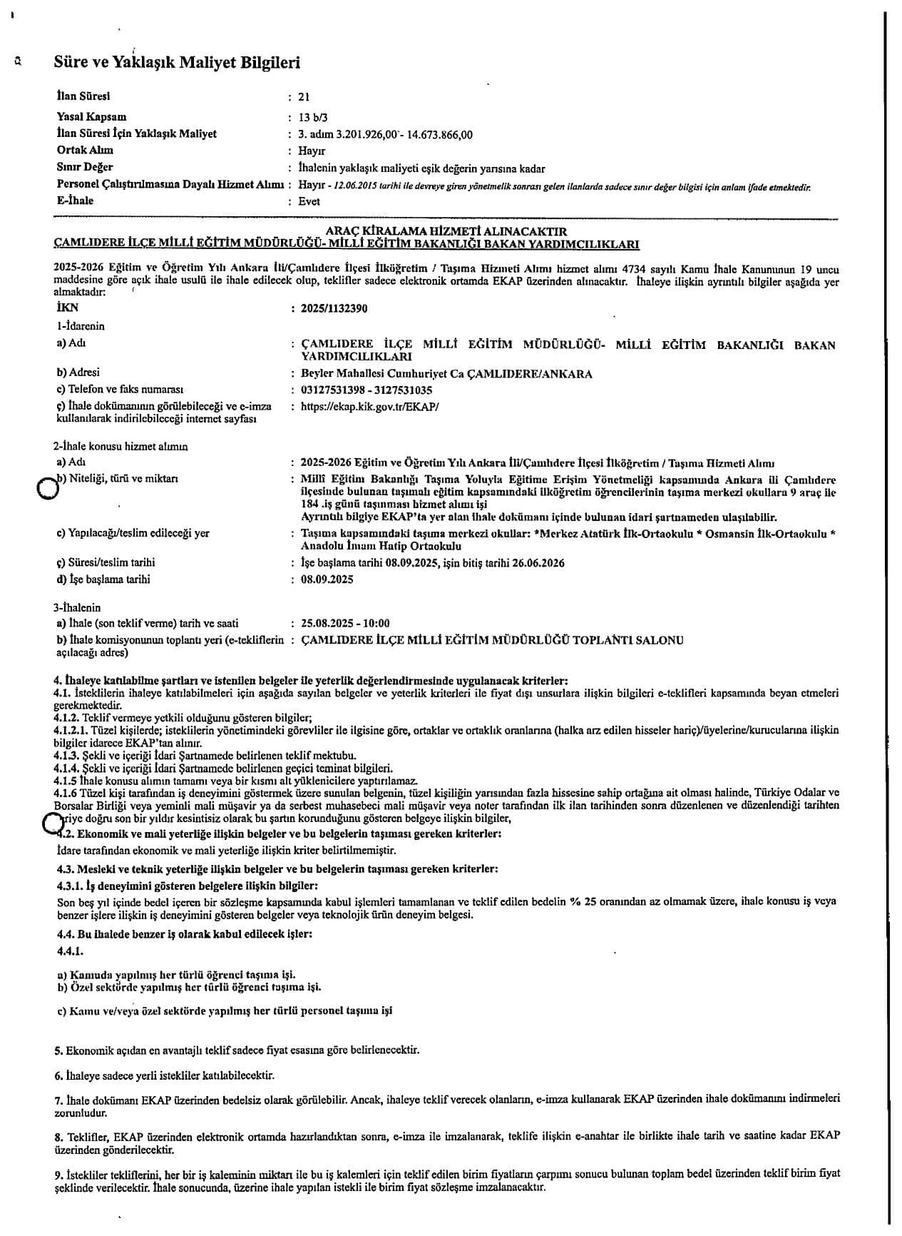 2025-2026 EĞİTİM ÖĞRETİM YILI TEMEL EĞİTİM TAŞIMA İHALESİ 25/08/2025 GÜNÜ SAAT 10:30 DA YAPILACAKTIR. İHALE İLE İLGİLİ İLAN VE DÖKÜMANLARA EKAP VE İLÇE MİLLİ EĞİTİM MÜDÜRLÜĞÜ İLAN PANOSUNDAN ULAŞILABİLİR. İLGİLİLERE VE KAMUOYUNA ÖNEMLE DUYURULUR.